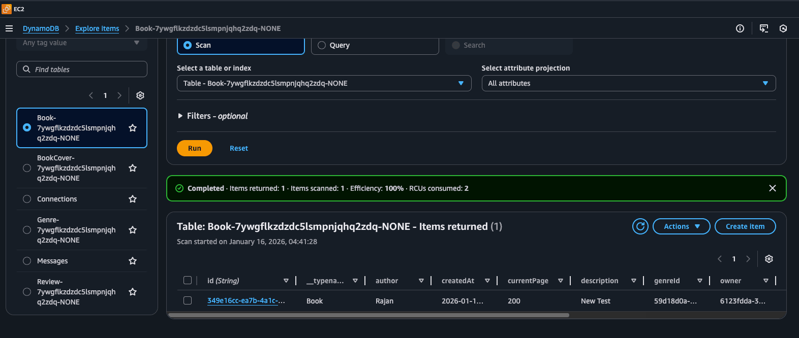 When you do a mutation (like creating a book), AppSync detects the change and pushes an update through that WebSocket to all subscribed clients. The latency is around 100-200ms from button click to seeing the update. Fast enough to feel instant.
