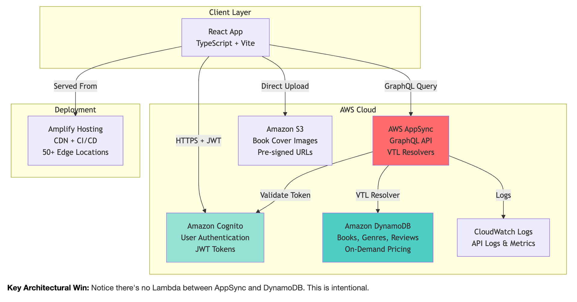 For basic operations like "get book" or "create book", AppSync talks directly to DynamoDB. No Lambda needed.