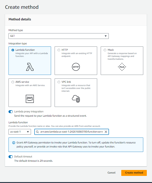 Check the toggle option to active related to “Lambda proxy integration“