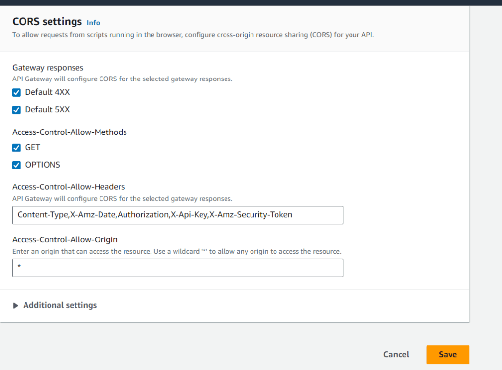 Below the form, check CORS (Cross Origin Resource Sharing), this will create an additional OPTIONS method that allows all origins, and common header. (Enable this to better avoid any CORS related issues when accessing API from Front-end).